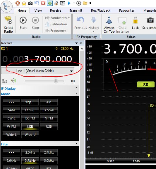 Two important things to note - firstly, the little yellow RX number does not change when I double click between the two receivers. (It always shows RX1 - but the frequency changes correctly).