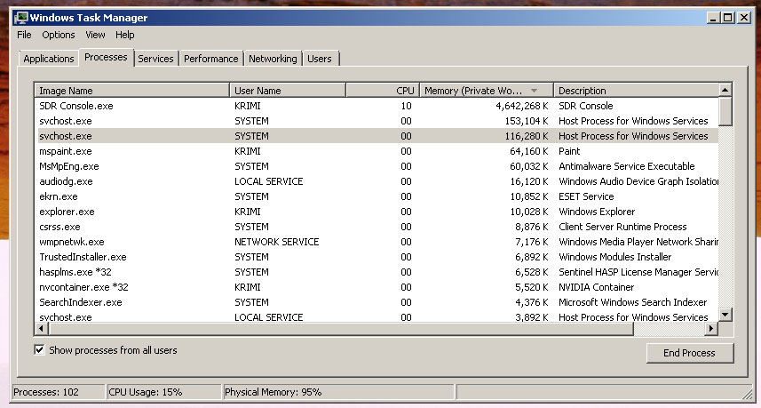 I will need a new computer for sure, this one is a spare notebook sitting on a shelf, so I thought I might get it to do something useful. I'll post some screenshots on how the memory gets too high when I uplug RTL-SDR and plug RSP1A. You can see it in the graph too. You can see the computer specs next to task manager screenshot /rtl-sdr plugged in/. The sdr console is minimised.. I am not sure if the possibility of turning the display off would help anything, I was just thinking and wondering if it might do any help.. Or maybe other settings will help too.
