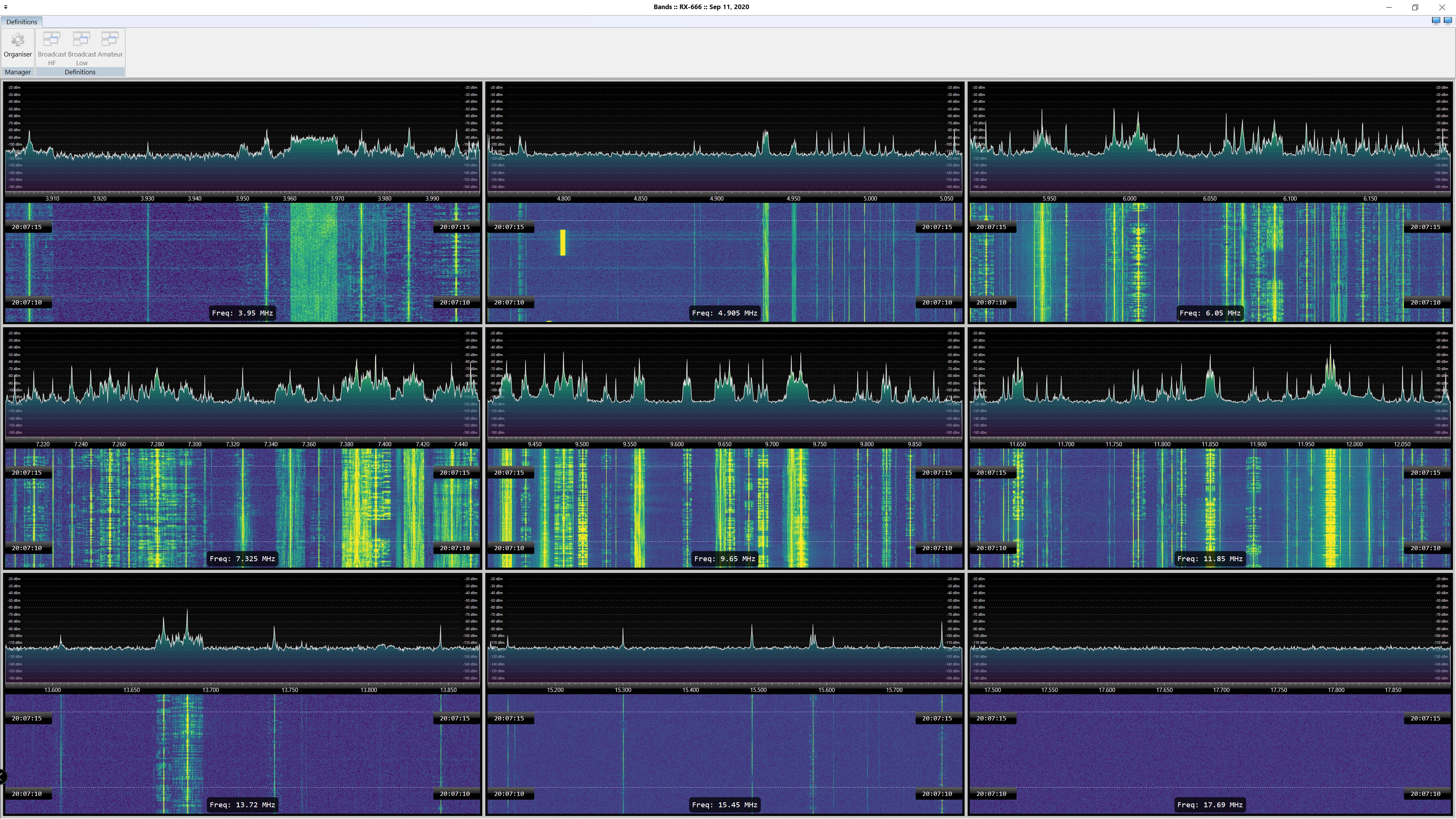 Something I've been meaning to write for a few years is a multi-band display. With radios such as the RX-666/888 it's quite easy to display as many bands as desired in one go. This will also be suitable for many other SDRs such as SDRplay.