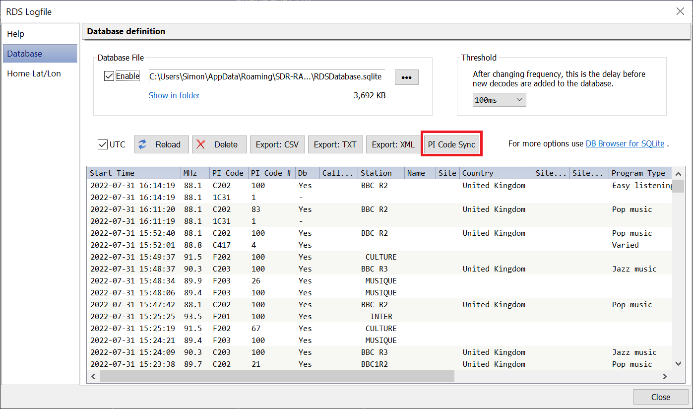 - Added (July 31) PI Code Lookup, uses the frequency database. Added a column 'Db' to the RDS Logfile, if the PI Code is found in the frequency database this column shows 'Yes' otherwise '-'.