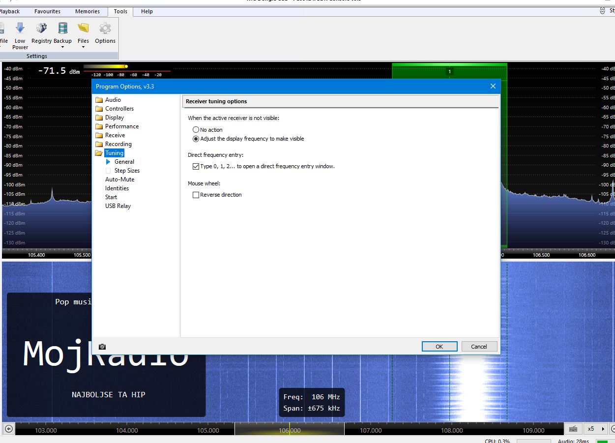As for where the mouse is and what scrolls, you will have to adapt to the program. In snarky terms I refer to this as the DWIM phenomenon. How do you, as a programmer, guess what the user intends? All you can do is be consistent. Where you clicked last can, due to Windows itself, make a big difference. And remember that the front end tuning behaves differently from an old vacuum tube radio with general coverage tuning and fine tuning. In SDRC when you change the front end frequency the rest of the radio remains tuned to the frequency it was last tuned to. The scales below the main spectrum and waterfall can be thought of as tuning the front end to a new center frequency. The keyboard tuning also does this. The individual receiver windows when active should give you a notion which frequency will be changed. Also explore clicking the mouse on a frequency. The active receiver is tuned to that indicated frequency. You'll likely have to do some fine tuning for it.