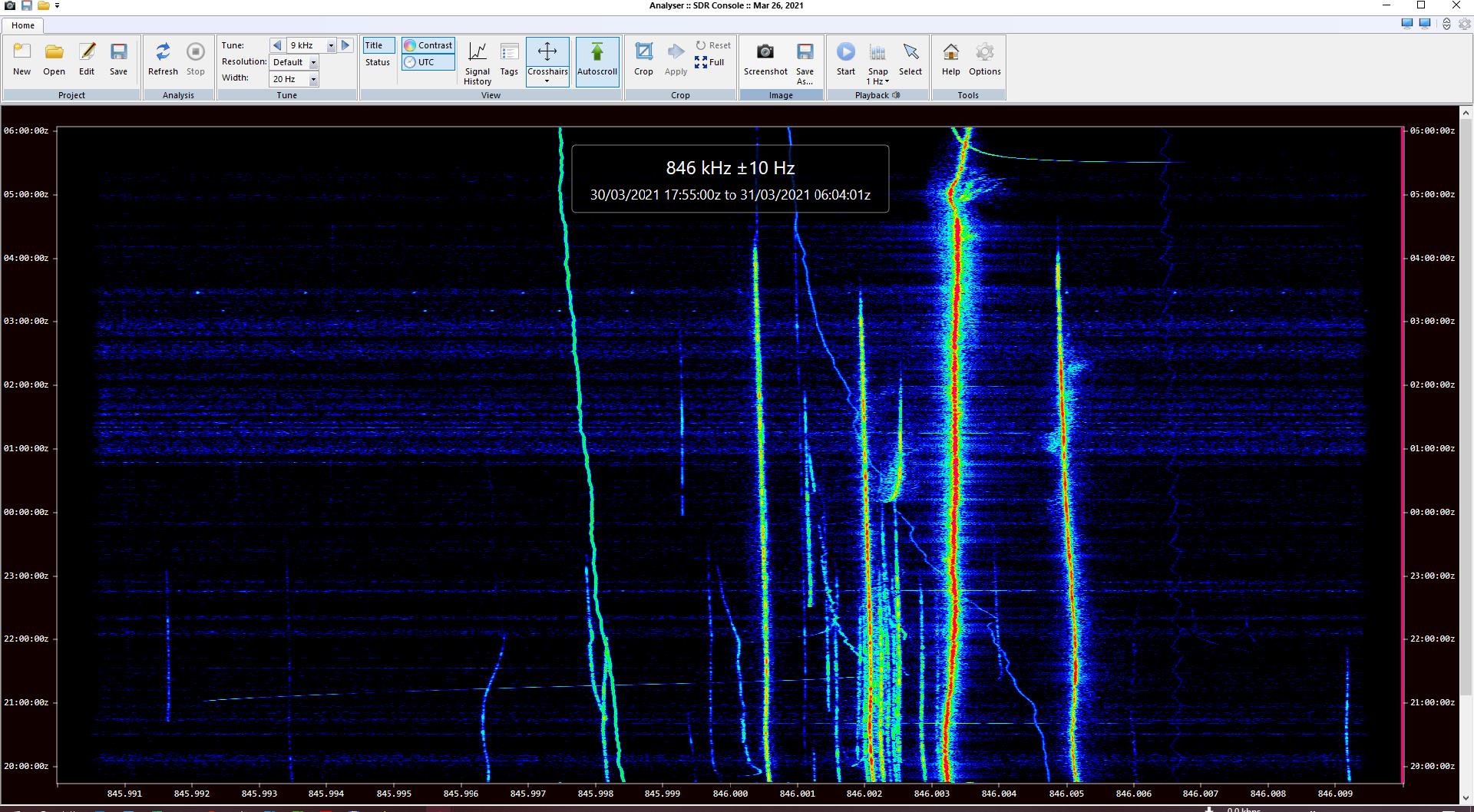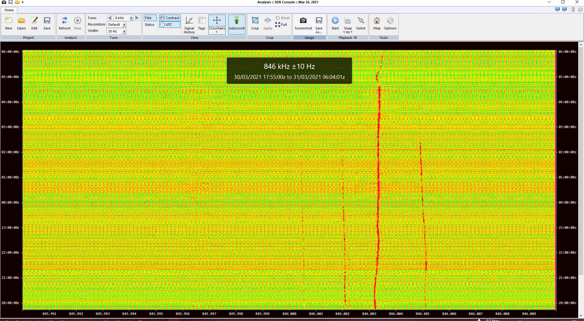 The sequence of attached screenshots show 3 successive analyses (in order 1 to 3) without closing the window in between. I just used the tuning button to step up 9kHz from 846 and in the 3rd to step back to 846kHz. Note the difference between 1 and 3 which are both 846kHz.