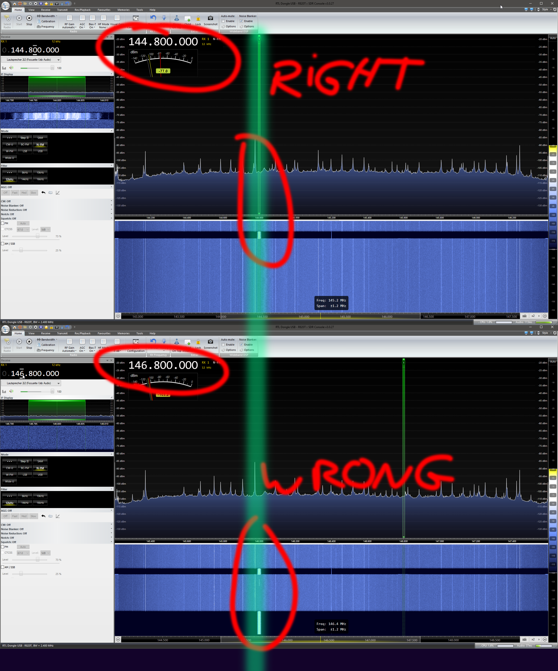 I checked it at the APRS signal @144.800 MHz which was correct at the start of the program. After I dialed around and back, the signal was on a different frequency BUT at the same position on the monitor! So I really dont know what to do to see and FIND signals on their frequency, when its wrong displayed after every change...