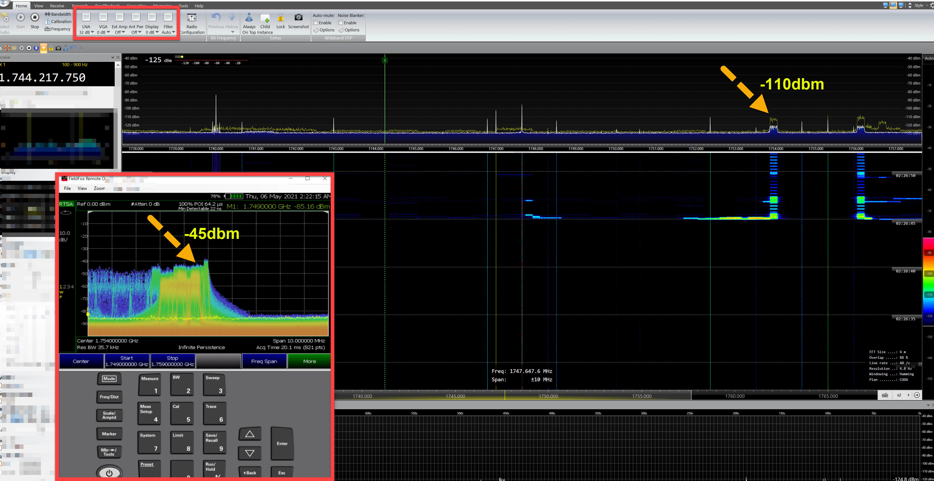 As you can see in the image, the Console shows the signal at about -110dbm, while the spectrum analyzer displays the signal at -45dbm (both HackRF and RTSA are placed at the same distance from the transmitter). The Console even needs the LNA at 32db to even show the signals. The Console is connected to a HackRF SDR unit.