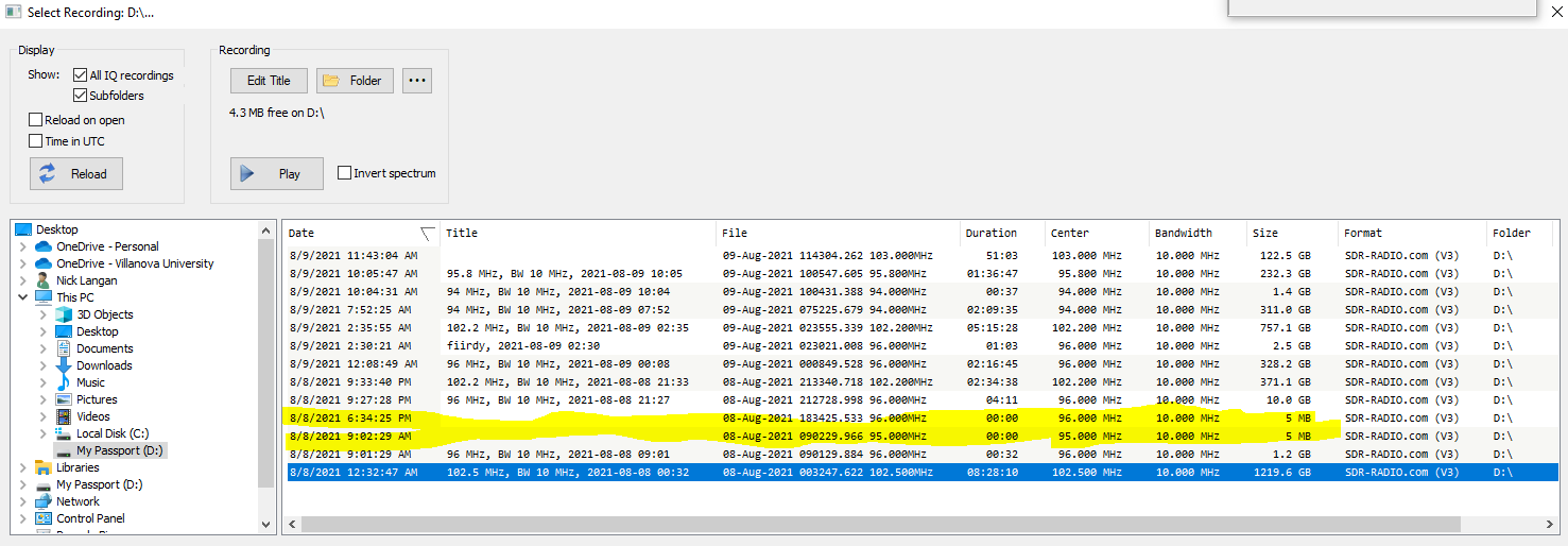 I recently took a trip to a more remote part of Virginia in the USA to make some IQ recordings to potentially capture some meteor scatter on the FM broadcast band. For the most part, mission accomplished! I used the Airspy v2 and SDR Console 3.0.27 on the laptop I had for the day. The laptop is running Win 10 and had ample resources, writing to an external USB 3.0 drive. In Console, I just used the option to record single file RF 64 WAV files as the IQ output. This worked for 9 of the 11 sessions I ran during the period. Two of the sessions, however, are not playing back in Console.