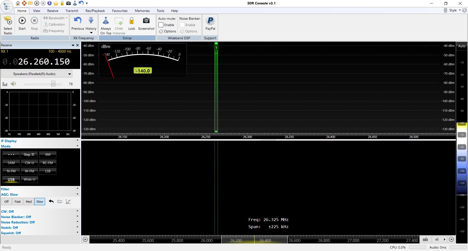 Hi Rick, we like to help you but you're having a problem with FM broadcasts audio so we can't help you with a screenshot of a 26Mhz band part in USB and a radio that is not running. Please have a look at my screenshot as a example. (small antenna so signals are not big)