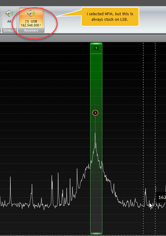 I can't paste a screenshot here, but I have chosen NFM to demodulate the NOAA broadcast, but the console is set to LSB. And how do I change the bandwidth? I can't expand the green box.