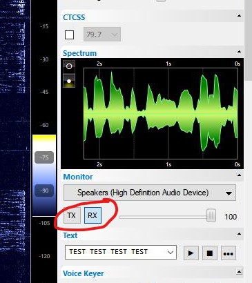 Forgot to mention. Did you know you can monitor your TX audio chain using the Spectrum Scope (great for checking if audio is top-clipping) and the audio monitor buttons I've circled in the attached picture?bob edwards wrote: Thu Oct 20, 2022 2:45 pm SDR Console 3.1 or 3.2 on Windows 10 - receive works perfectly, transmit very heavy dalek like distortion - disabling CUDA seemed to make no difference. The same distortion also shows up in a recording started from the SDR Console 'Record' button.