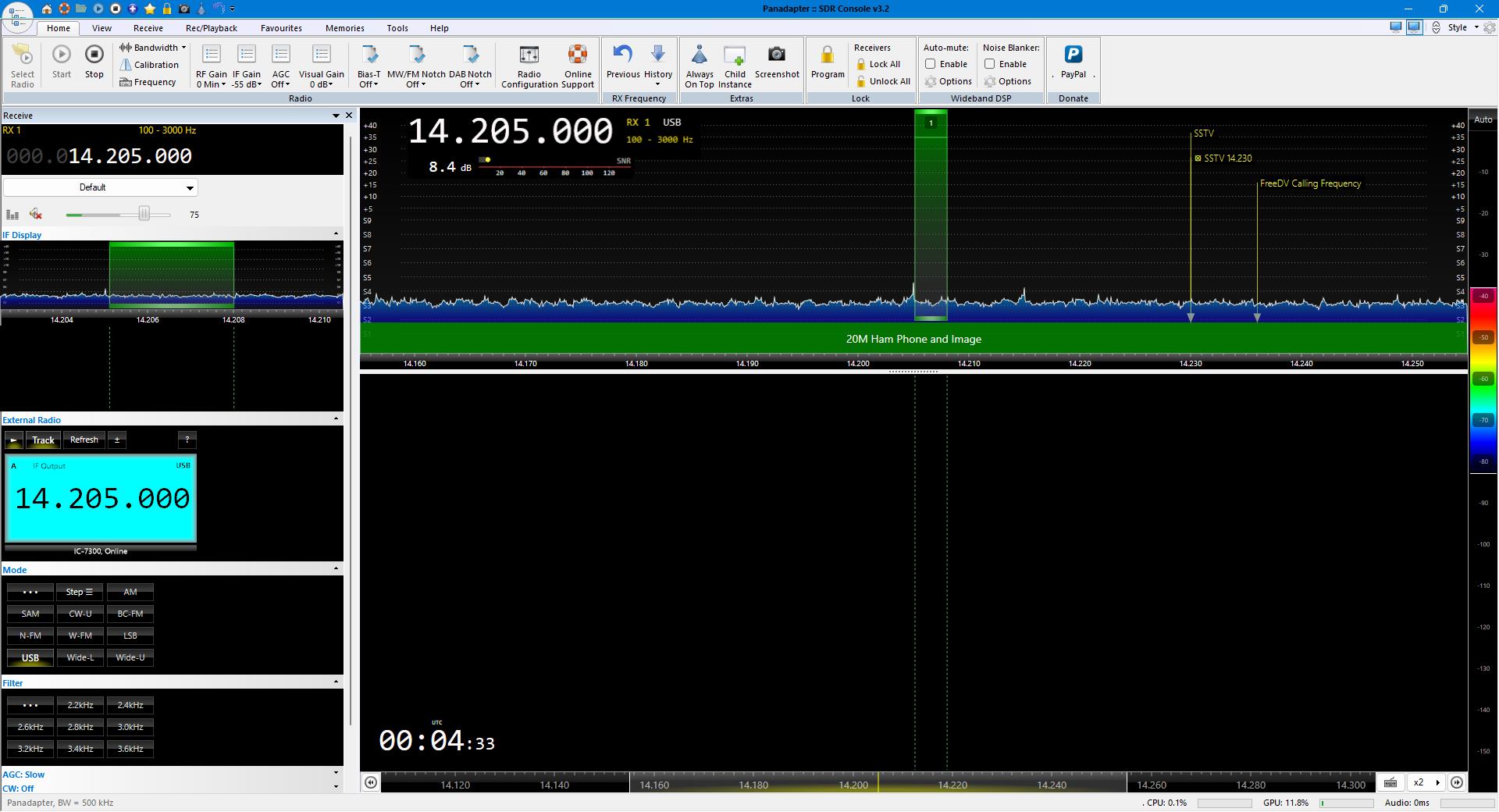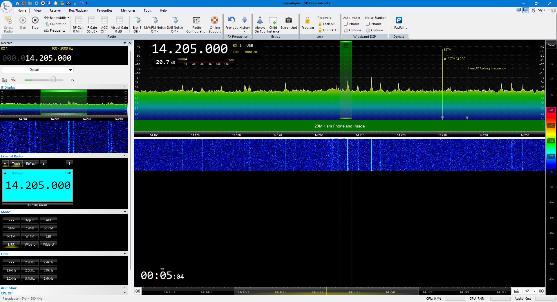 Running a IC7300 with an internal PTRX-7300 panadapter connected to an RSP1A SDR.