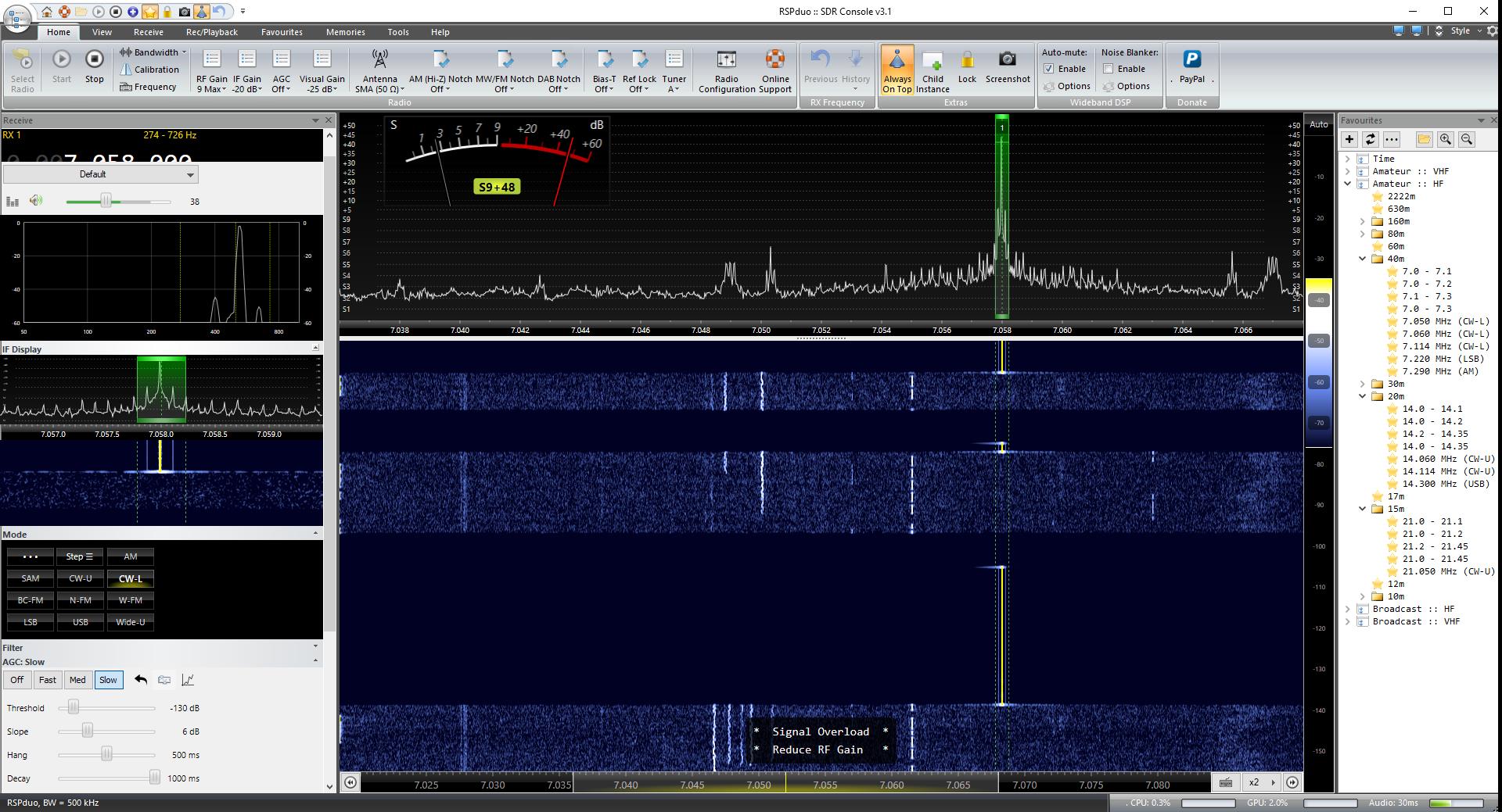 Second, The Auto-mute is now not engaging despite setting it accurately about 5db from activation. AGC on, AGC off, no auto-mute. Sometimes, I'll close the program and restart and it will activate properly. Other times, like now, with a 30dB overage, it is not muting. Very strange. It worked great all day and now it's like it not even there. If I set the overload parameters higher than the current setting while not transmitting, it mutes normally. If I want to receive, I set the limit about 5dB lower than the Current and it receives. As soon as I hit the CW key, no mute.