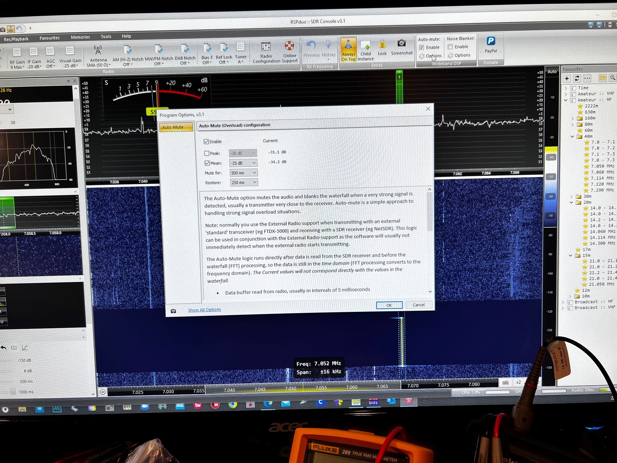 I set the level as close to the idle signal level as possible without causing auto-mute kicking in inadvertently. About 5dB seems to be as close as you can get reliably. I know how to use the settings. As I stated, it worked perfectly for seven hours of operating my transmitter with the software as my receiver over the weekend. This isn’t something I’m doing wrong. If I set 30 dB as the trip point, a 60 dB signal should easily trip the auto-mute. In fact, when the software was working for me, even using the spot/calibrate function on the transmitter, which on a Hallicrafters HT-32B is variable, I could set a calibrate level that would trip the auto-mute successfully. (When the auto-mute was working).