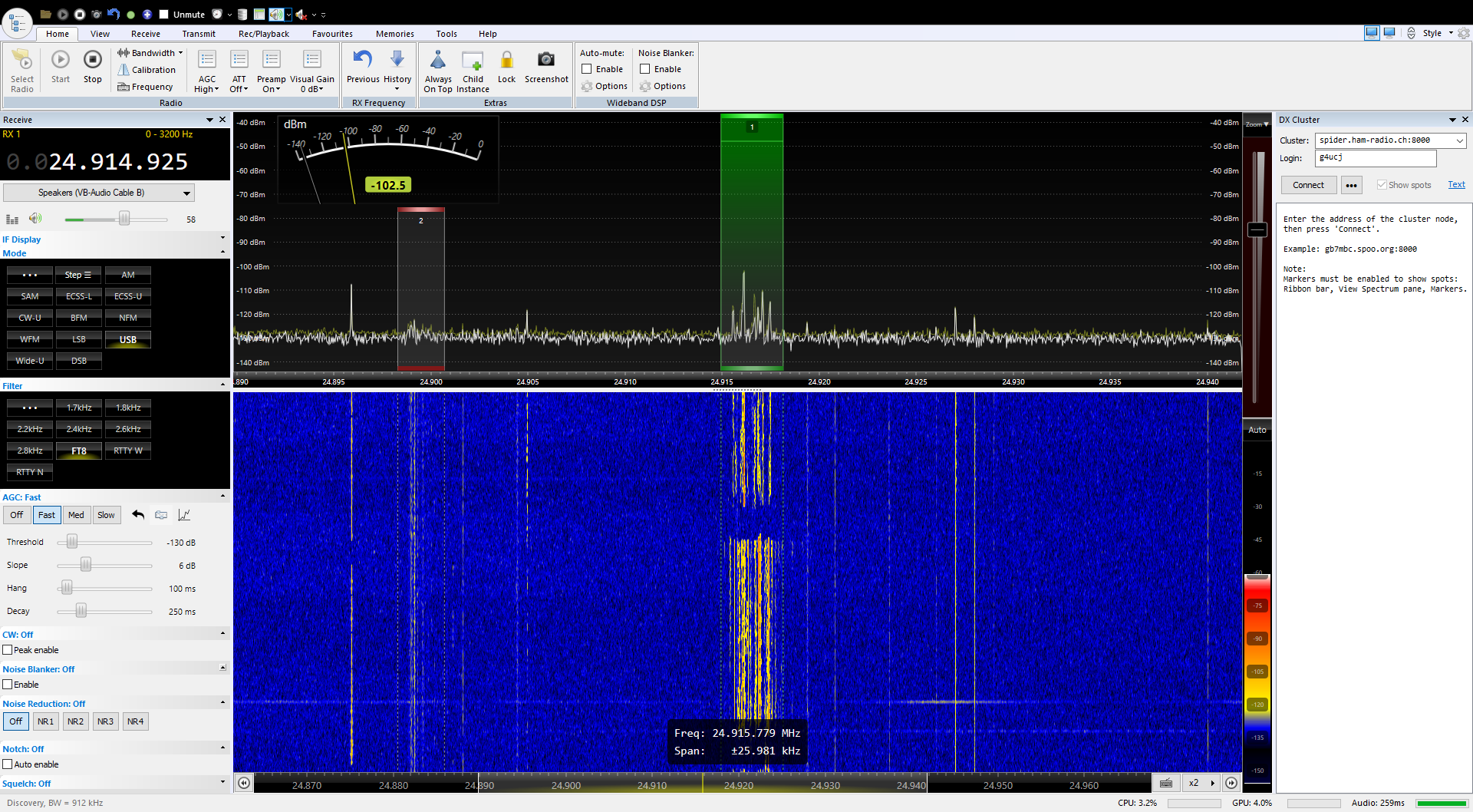 Instance 2: SDR: Airspy HF+ Discovery running 768MS on SDR Console, with 2 virtual receivers active: 1> HF digimode; 2> HF CW/SSB or SW Broadcast AM) + 1 virtual audio cable.