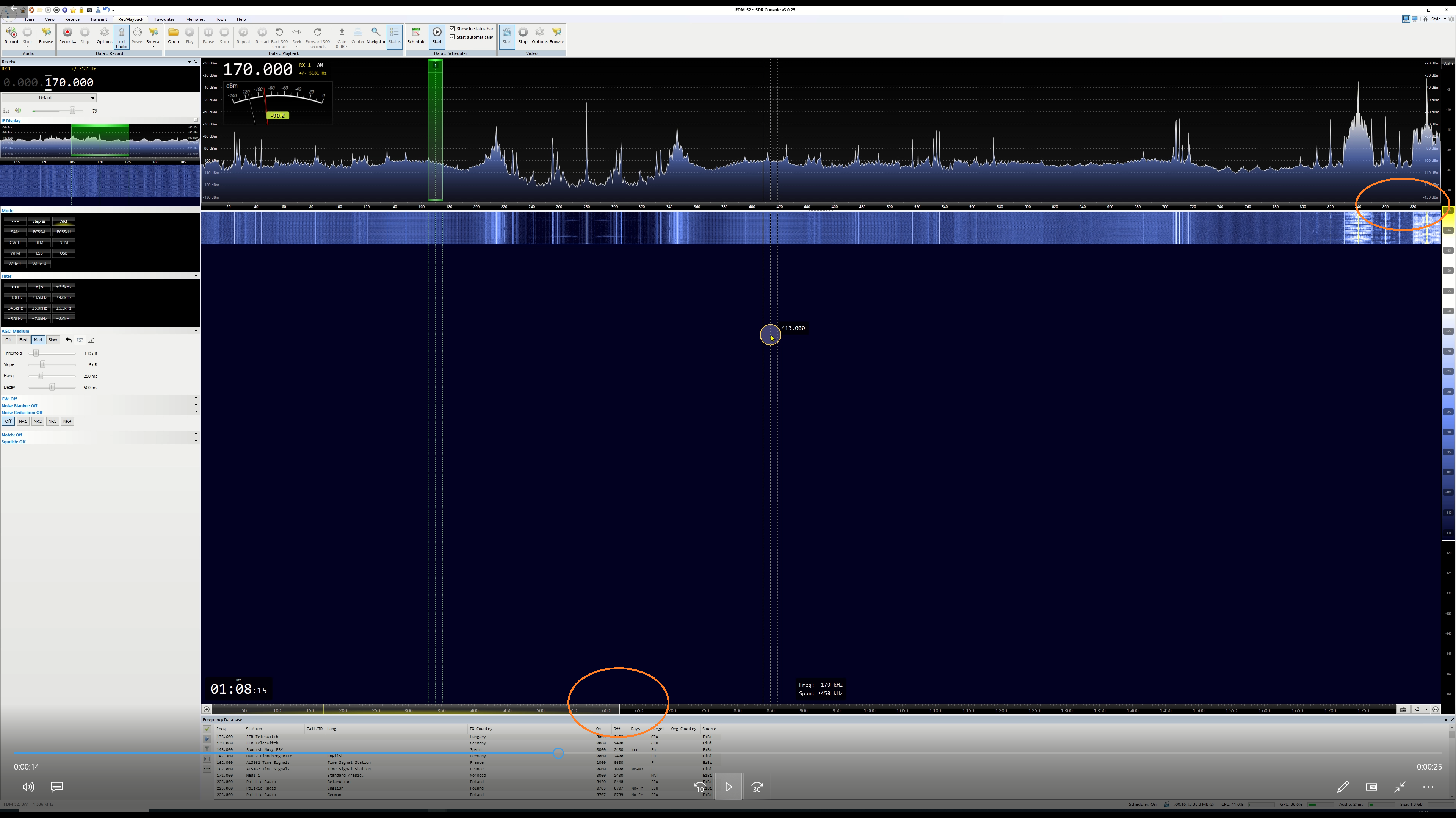 For example, when I enter "170" on the keyboard to tune to 170 kHz, I see AM broadcast stations offset from where they should be. The first one, at 840 kHz on the display, is actually at 560 kHz. Note that when I click on the signal at 840 kHz, the green band that indicates where I'm tuned actually appears at 560 kHz.