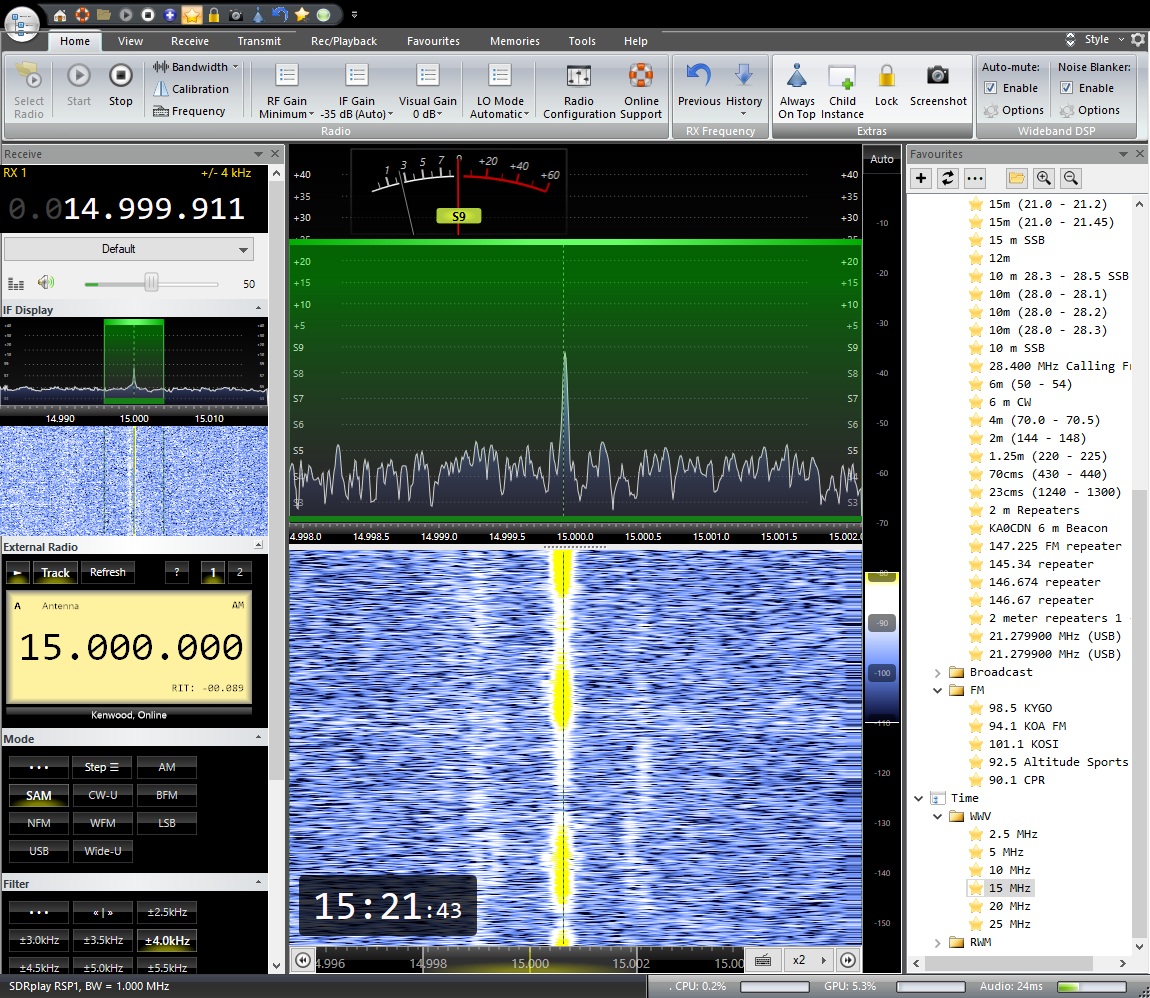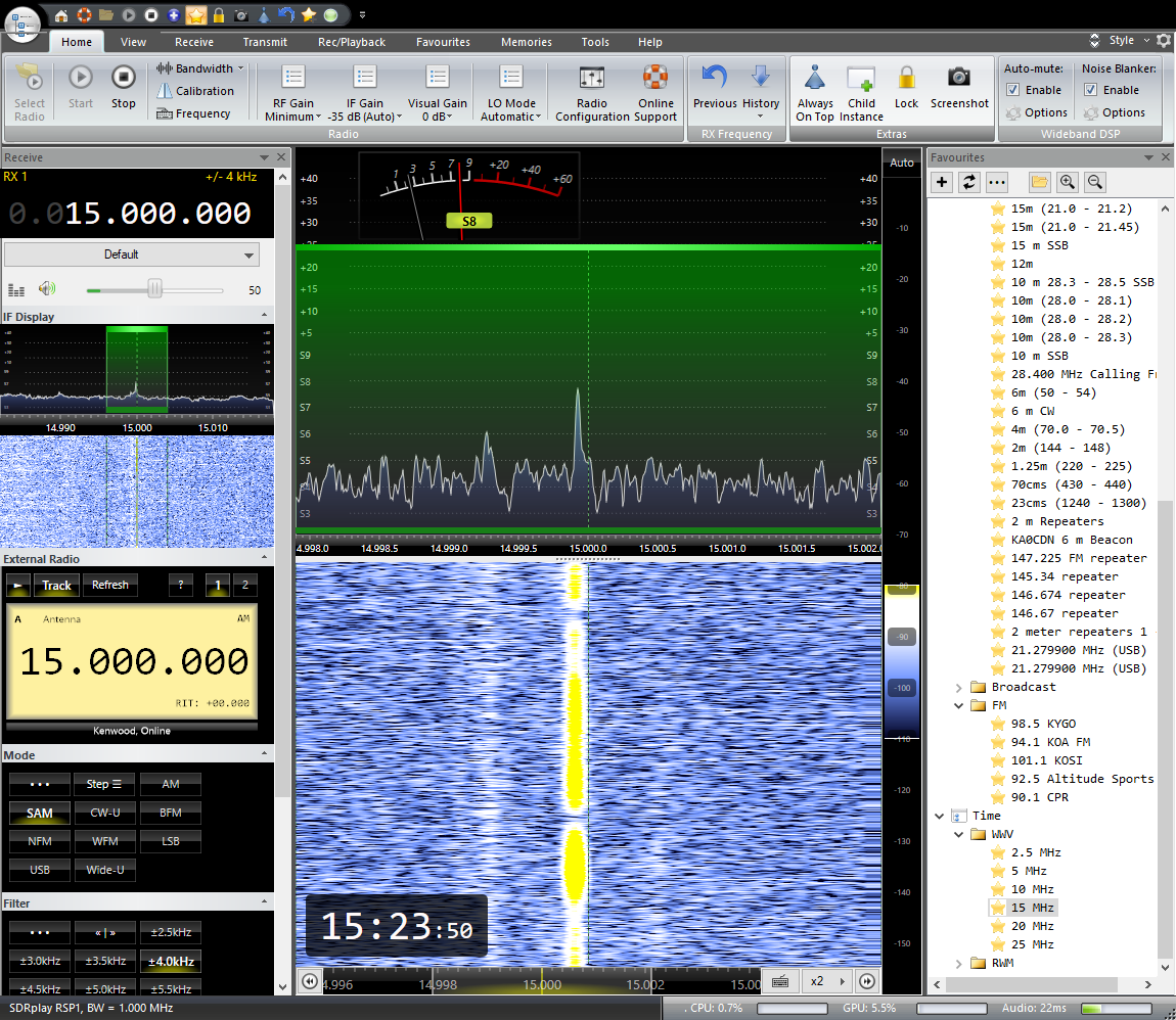 Screenshot 152350 show SDR Console tuned to 15.0 MHz WWV. You can see the signal is a bit low.