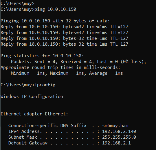 Reply from 10.0.10.150: bytes=32 time<1ms TTL=64