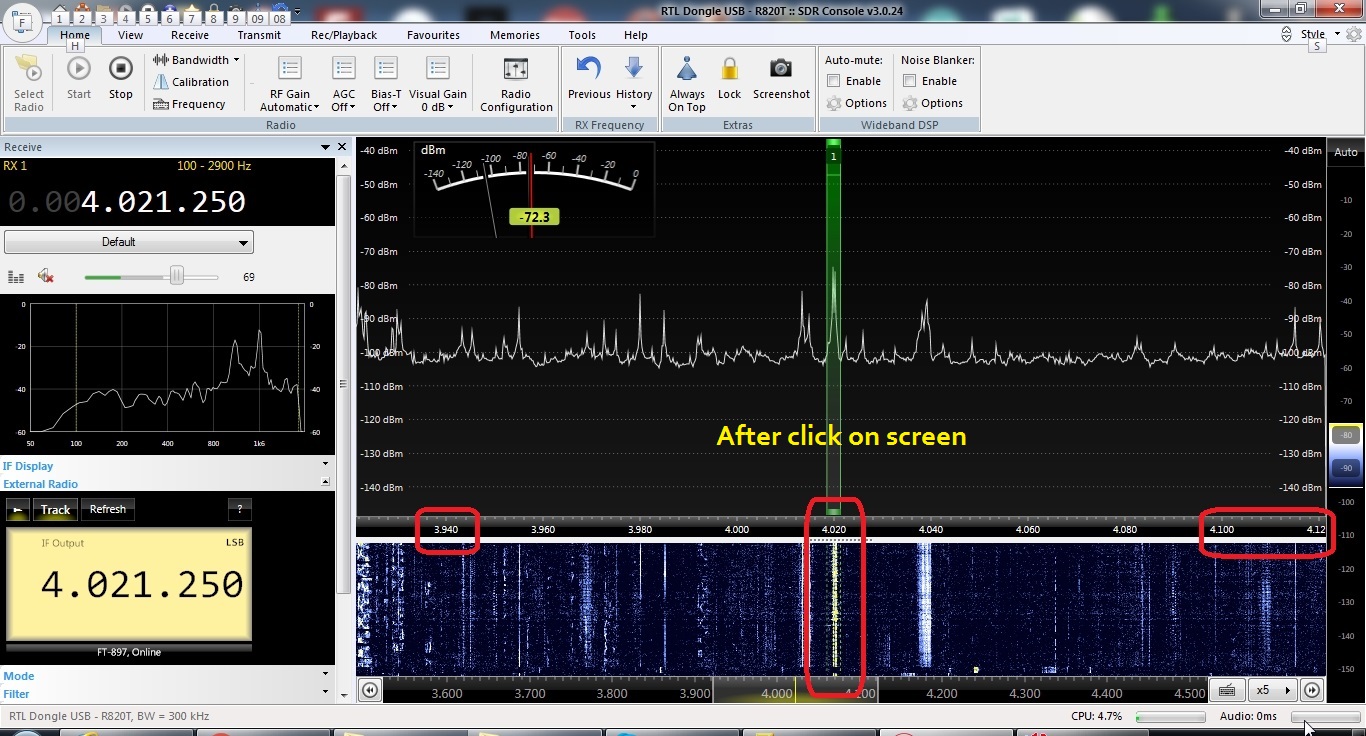 After selecting the 4020 KHz frequency, it is from 3940 to 4120 KHz. Radio transmissions between 3900 and 3940 have disappeared.