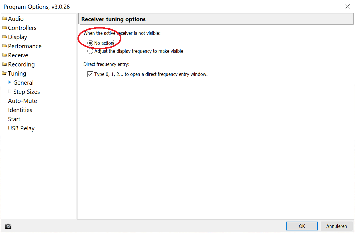When set to NO ACTION you can tune (ext radio or SDRC) as much as you like but the FFT freq range doesn't change, so you can easely go back.