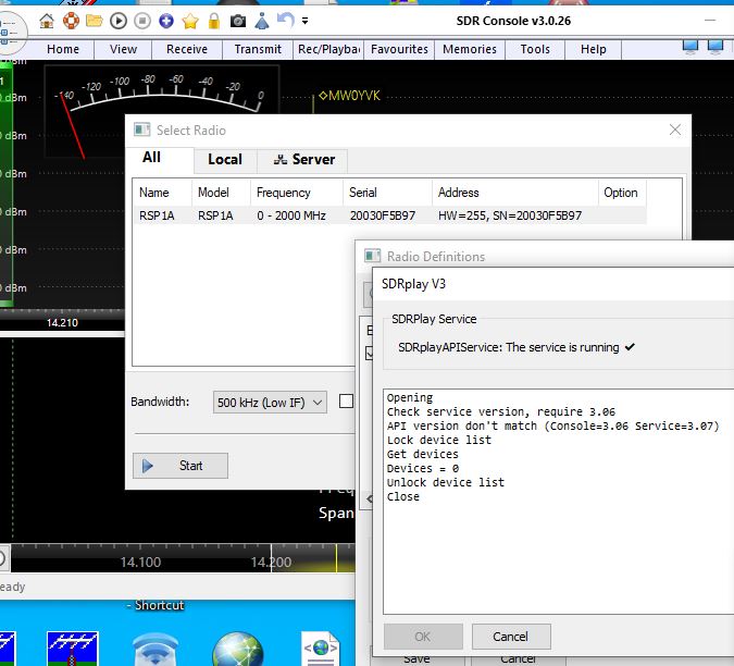 When it does not work correctly, the window opens, but the RSP1A output is not displayed. The cluster spots are displayed. If I click the small 'Play' arrow icon, nothing happens. If I go to the 'Select Radio' dialogue, I see the error message I referred to earlier.