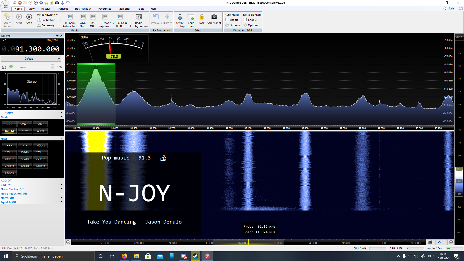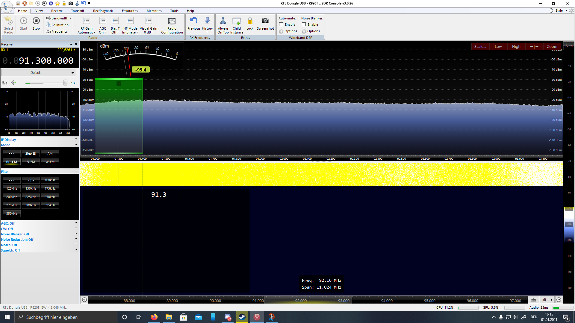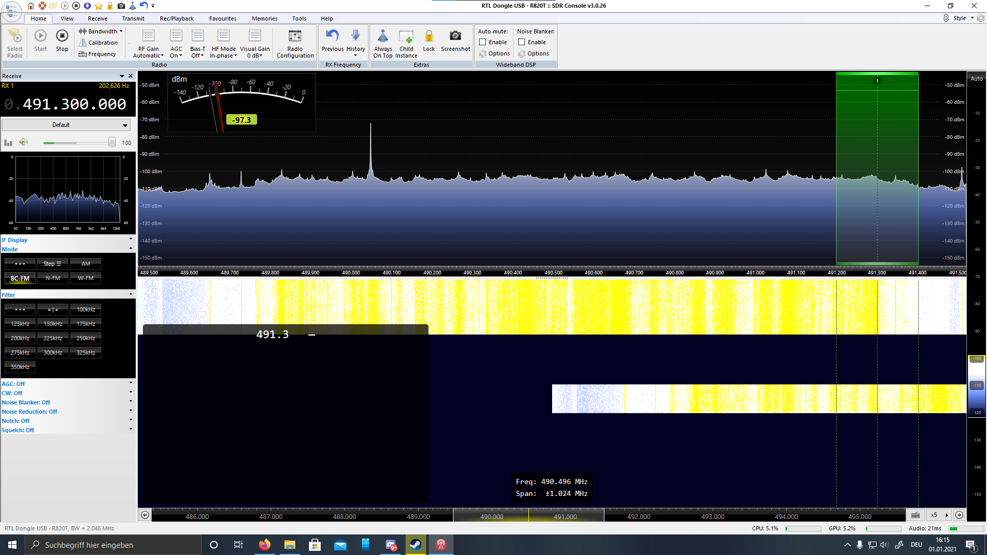 Then I try to tune back to 91.3 MHz (which did not work, same waterfall as 491.3)