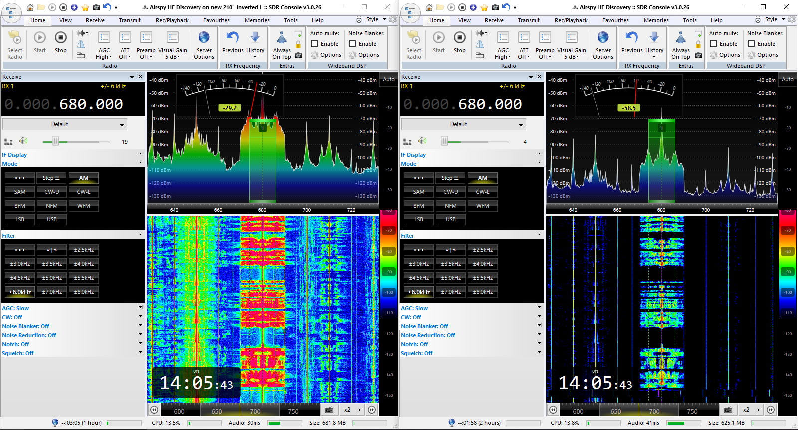 OK, here's a test with two instances of SDRC running. Both are AirSpy units, with the exact same gain settings. The left-hand image has no AM BC filter, the right has the W1VLF home brew filter. Note the yellow box under the S-Meter, one is at -29.2 and the other at -50.5. Using 'new math' aka 'public math', that's a 29.3dBm difference! Somewhere, I have before and after images of the SDRPlay that is using the AM BC filter. It too was just dramatic as the image below.