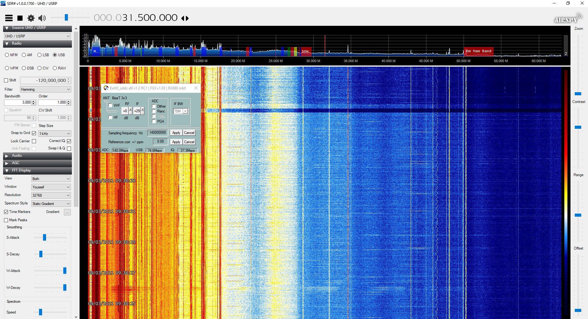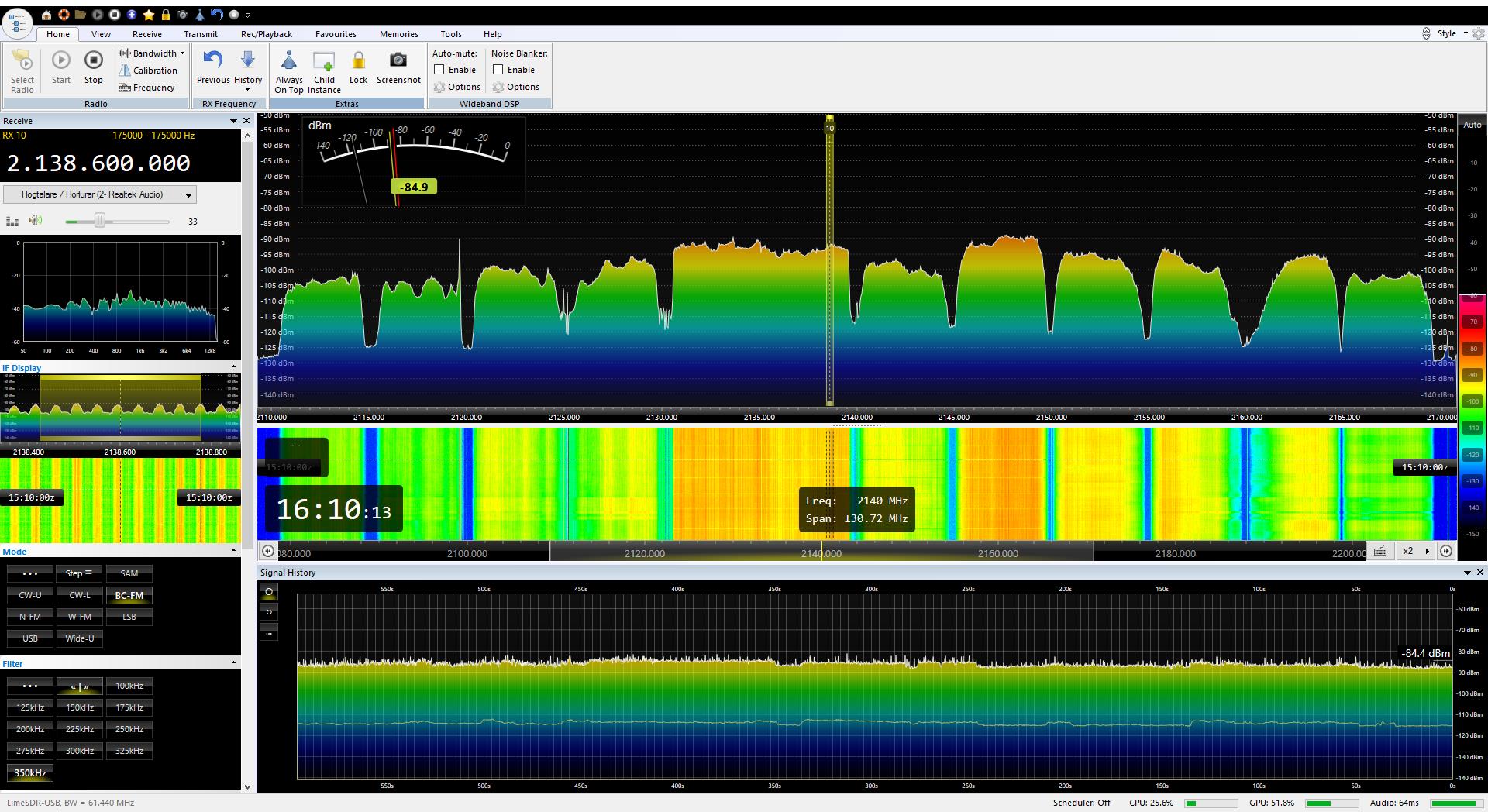 At present, from the feedback of HDSDR, we can see that HDSDR can't calculate so much data, and FFT can't handle it. It can't run 64M bandwidth on my PC i5 4590, but it can run 64M normally on i7 3770 of ik1xpv. I think if It should be possible to have a computer with sufficient performance. Of course, it is best to be able to continuously optimize and reduce the hardware requirements through software.